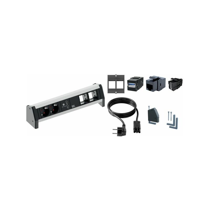 ————- für den Markt: D / NL / A / L —————- 2x USB Ladebuchse, 2x Schutzkontakt, 2x konfigurierbares Modul, Steckdosen in 35 Grad-Anordnung, 16A/230V Stromanschluss, mit GST18 16A Buchsen, LÂnge Leiste: 324 mm (902.0183)