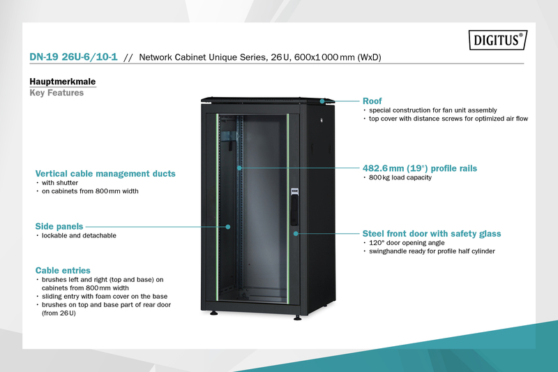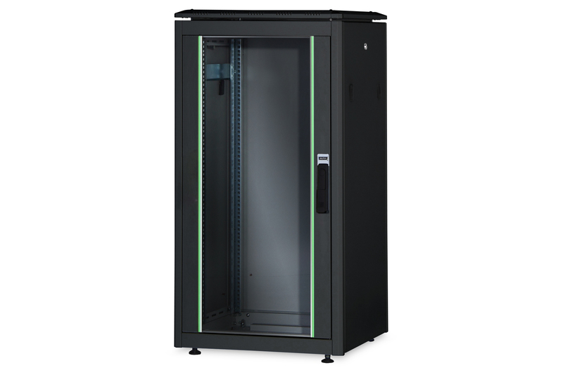 Unique Serie, 1,5 mm Stahlblech, Fronttür aus komplettem Metallrahmen mit Sicherheitsglas, Belastabrkeit: 800 kg, Schwenkhebelgriff abschließbar, IP20, Maße: (B)600 x (T)1.000 x (H)1.342 mm, schwarz (DN-19 26U-6/10-B-1)