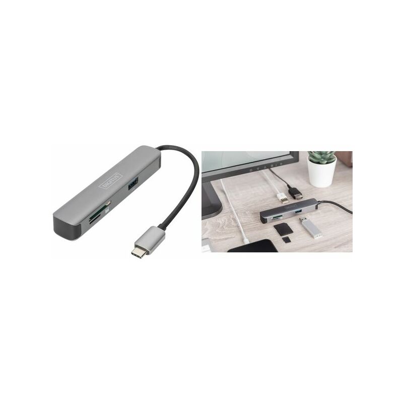 ajoute 5 interfaces supplémentaires à la tablette, le smart- phone ou l’ordinateur portable, entrée: USB-C, sorties: 2x USB 3.0, 1x HDMI, 1x SD, 1x micro SD, dimensions: (L)110 x (P)23 x (H)16 mm (DA-70891)