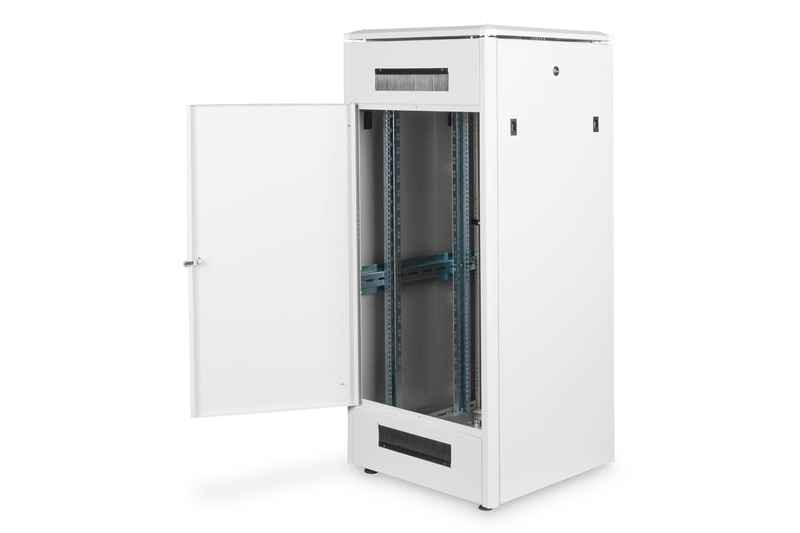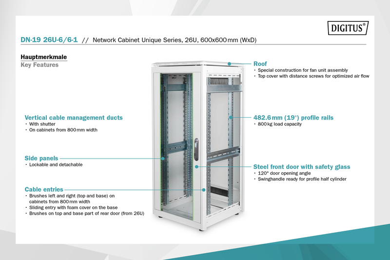 • caractéristiques: 1,5 mm de tôle en acier solide • construction modulaire avec cadre en aluminium • cadre très stable grâce à une technique spéciale de pliage de tôle • angle d’ouverture de la porte: 120° , porte avant et arrière • charnière de porte facilement changeable • dispositif d’aération du toit pour l’accueil des tôles du ventilateur • rails profilés 19″ montés à l’avant et à l’arrière de la baie • rails profilés 19″ à profondeur variable • rails profilés 19″ avec inscription U • pieds de nivellement pour un montage et un positionnement sûrs • plusieurs points de mise en terre dans la baie pour les composants du montage