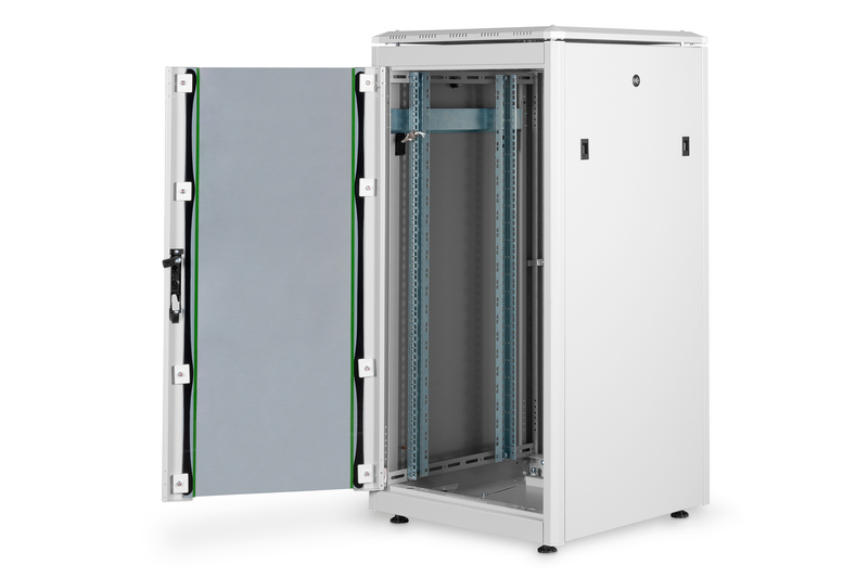 • caractéristiques: 1,5 mm de tôle en acier solide • construction modulaire avec cadre en aluminium • cadre très stable grâce à une technique spéciale de pliage de tôle • angle d’ouverture de la porte: 120° , porte avant et arrière • charnière de porte facilement changeable • dispositif d’aération du toit pour l’accueil des tôles du ventilateur • rails profilés 19″ montés à l’avant et à l’arrière de la baie • rails profilés 19″ à profondeur variable • rails profilés 19″ avec inscription U • pieds de nivellement pour un montage et un positionnement sûrs • plusieurs points de mise en terre dans la baie pour les composants du montage