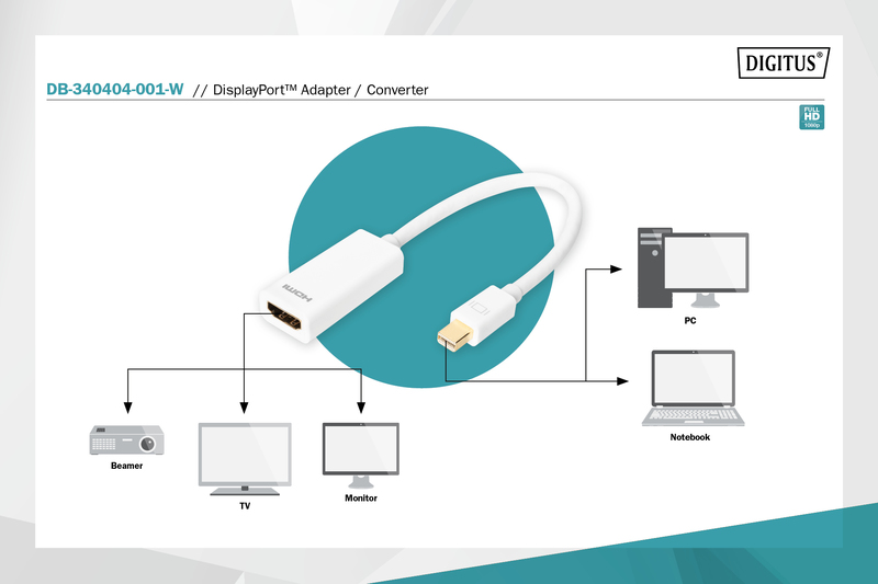 DIGITUS Câble adaptateur, DisplayPort Mini – HDMI Type A, 0,15 m, mâle DisplayPort Mini – femelle HDMI Type A, manchonmoulé, double blindage, AWG: 32, longueur: 0,15 m, couleur: blanc, dans un emballage blister (DB-340404-001-W)