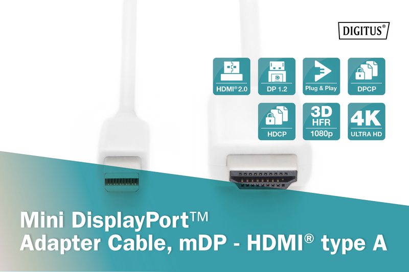 DIGITUS Câble d’adaptateur Mini Display Port, mDP-HDMI-A, 2mmini fiche mâle DP – fiche mâle HDMI-A, DP 1.2, HDMI 2., AWG 30, triple blindage, surface de contact : nickelé, gaine : moulé, câble / fiches : blanc (AK-340304-020-W)