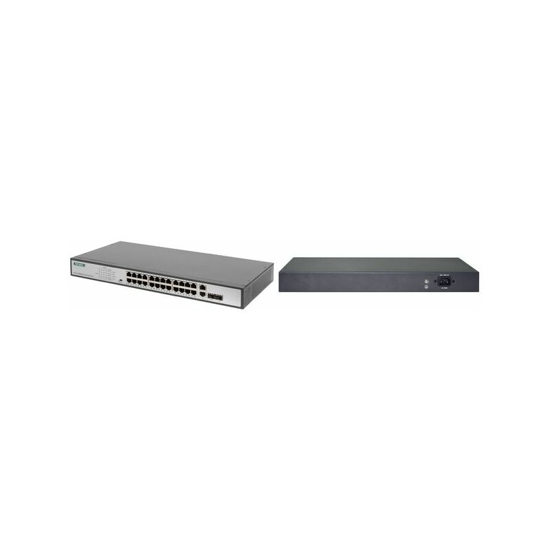 unmanaged, 24 ports 10/100Base-TX avec prise en charge PoE, 2 ports Combo Gigabit TP/SFP Uplink, conforme aux normes IEEE 802.3, sortie courant PoE 55V tension électrique conti- nue, max. 30 W par port, mode d’alimentation PoE A, (DN-95343)