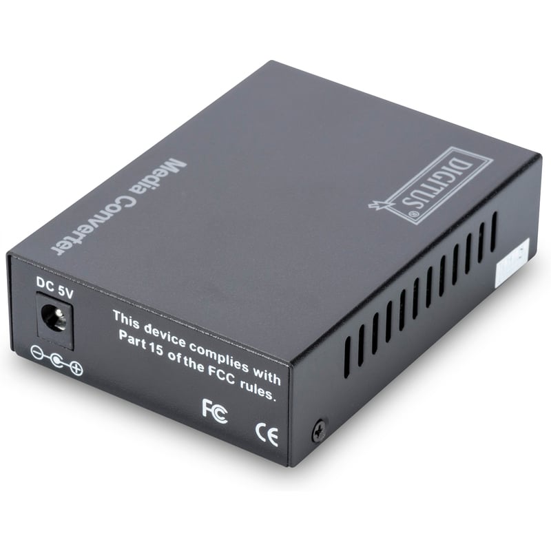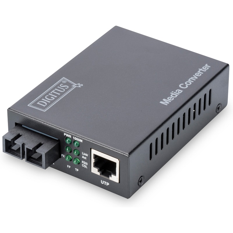 mode,convertit les signaux réseau de câble en signaux de fibre optique, RJ45 10/100/1000BaseTX – SC fibre optique, portée de jusqu’à 0,5 km, auto-détection full & half duplex, affichage LED, supporte le full duplex & half duplex, noir boîtier métallique,dim.: (L)95x(P)70x(H)26 mm (DN-82120-1)