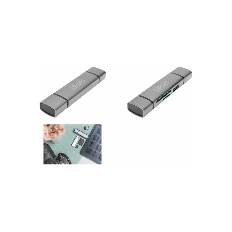 gris, prise en charge des cartes SD/MicroSD jusqu’à 2 To, port 1 : USB 3.0 (USB A), port 2 : USB-C USB 2.0, contacts plaqué or 30 my, systèmes d’exploitation pris en charge : Windows 10/8/7, macOS 10.2.8 o. hËher, iOS, Android avec OTG (DA-70886)