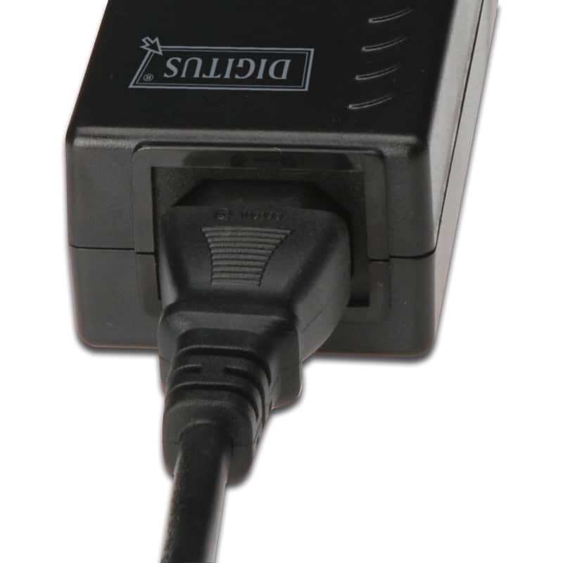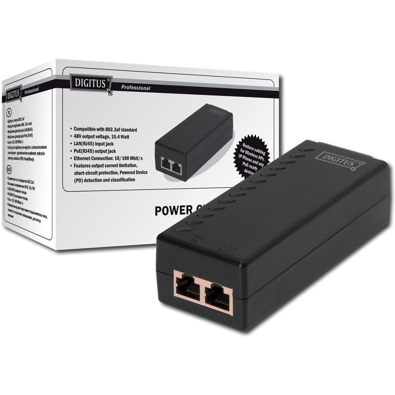 tension de sortie de 48 volt / 15,4 Watt, 1 x entree RJ45 LAN, 1 x sortie RJ45 PoE, câblage: 10/100 Mbps, couleur: noir, dimensions: (L)12 x (P)19 x (H)9 mm contenu de la livraison: injecteur PoE, guide d’installation rapide, manuel d’utilisation (DN-95102)