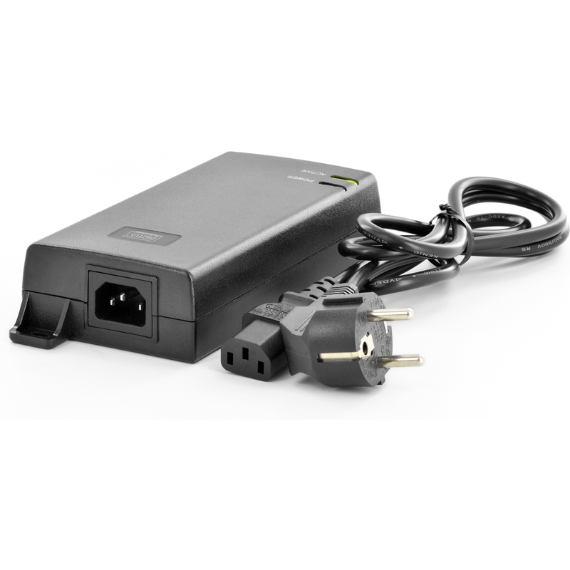 tension de sortie 55 volts, 1 x entrée RJ45 LAN, 1x sortie RJ45 PoE, 10/100/1000 Mbps.Gigabit, couleur: noir, dimensions: (L)85 x (H)40 x (P)193 mm (DN-95104)