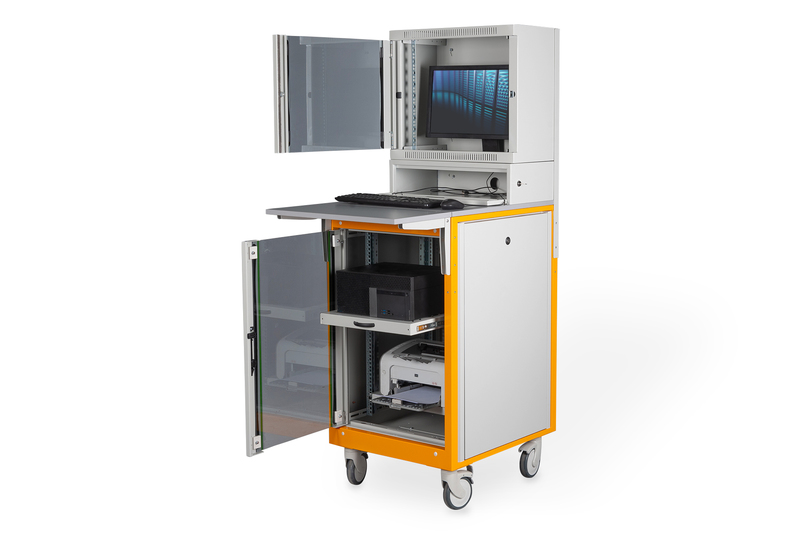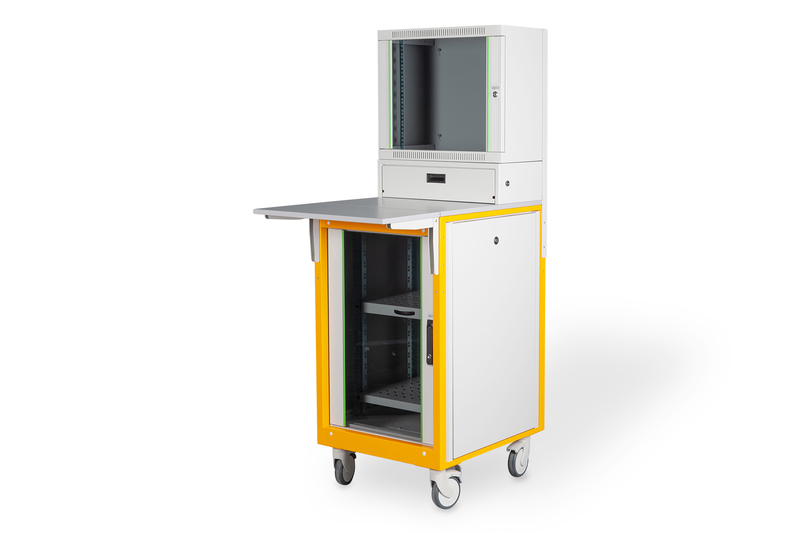 permet de combiner une baie réseau de 19″ avec une station de travail mobile pour une utilisation flexible