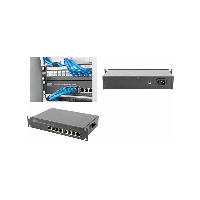 8 x RJ45, compatible IEEE 802.3, IEEE 802.3u, IEEE 802.3ab, IEEE 802.3x et IEEE 802.3af/at, RJ45 10/1000 Base-T, dimensions: (L)150 x (P)250 x (H)42 mm, (DN-80114)