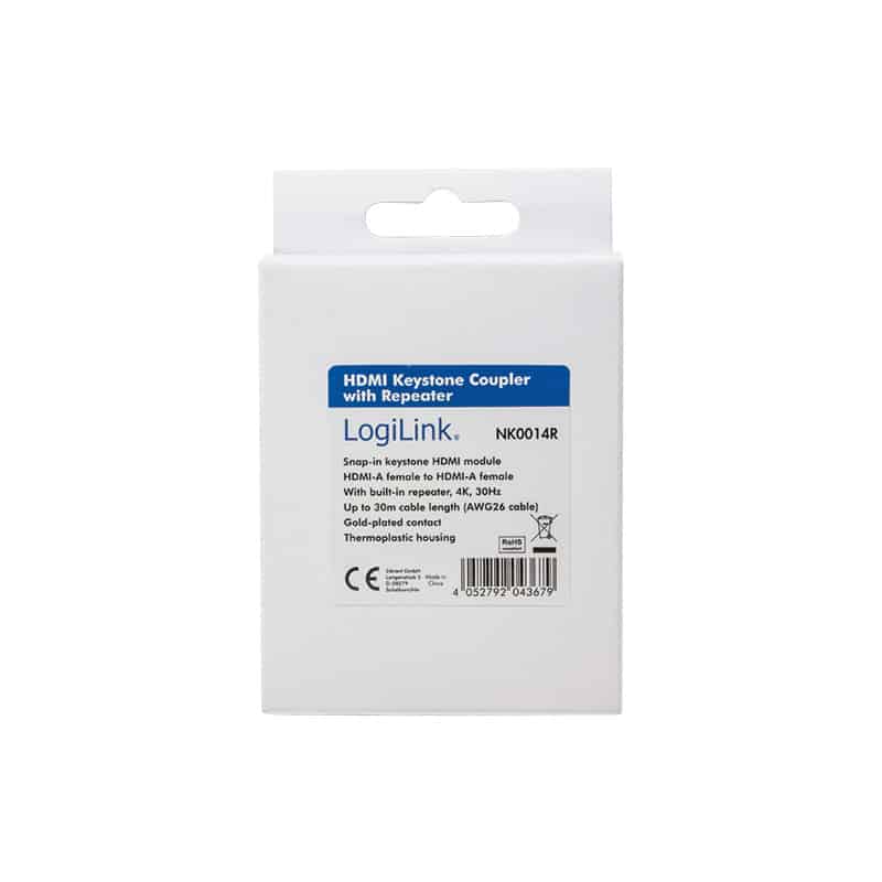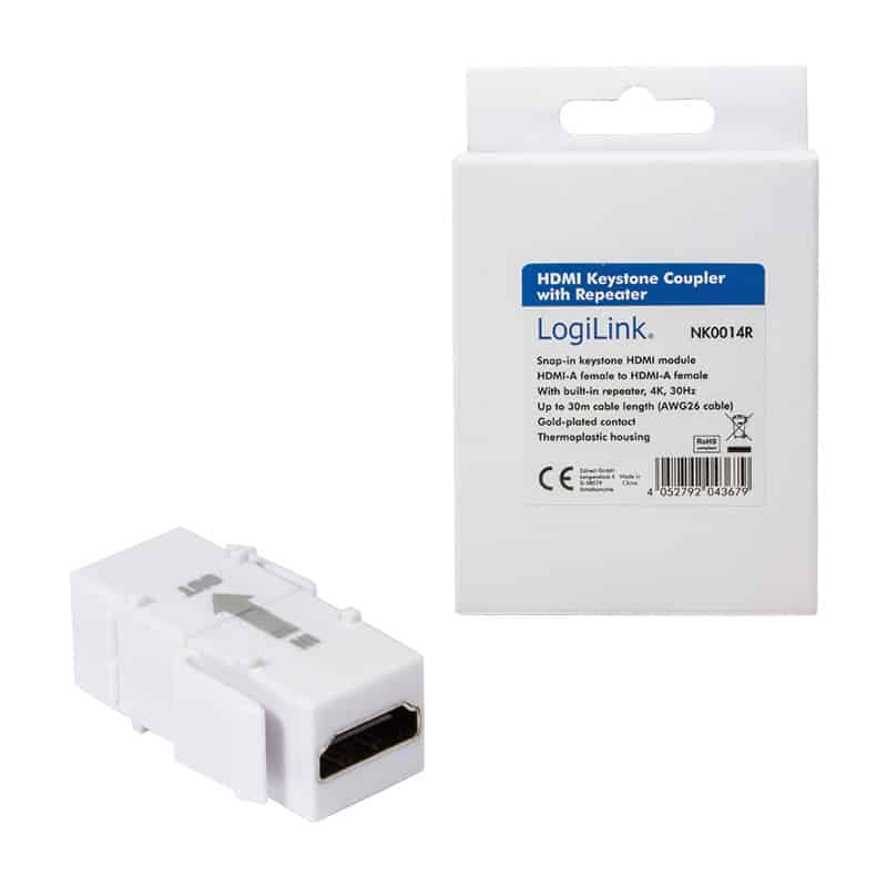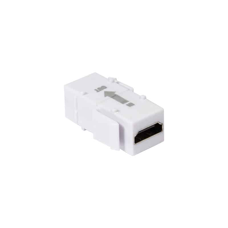 avec dispositif de verrouillage pour panneaux & boîtes standard Keystone, pour une connexion facile du câble HDMI, 2x HDMI femelle, avec répéteur intégré, 4K, 30 Hz, affectation : 1:1, blanc, contacts dorés, (NK0014R)