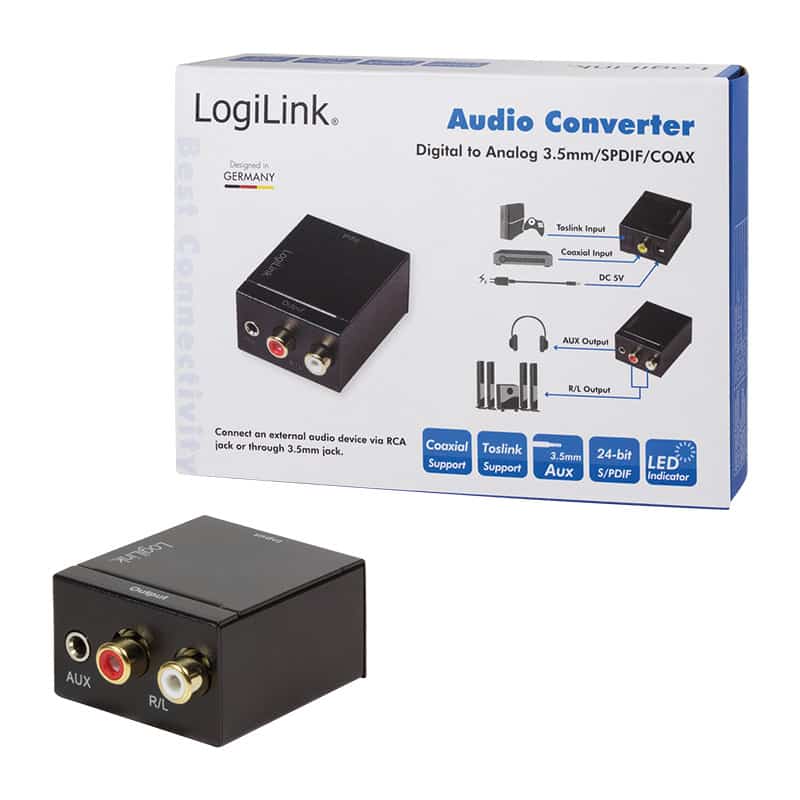 3,5 mm/SPDIF/coaxial, convertit des signaux sonores numériques coaxiaux ou optiques en analogiques L/R, entrée: 1x Toslink, 1x RCA (coaxial), sortie: 2x RCA (L/R Audio), 1x jack 3,5 mm, débit binaire: 24-Bit, couleur: noir, (CA0101)