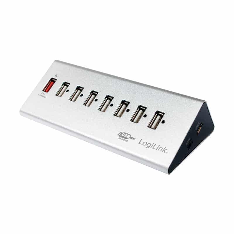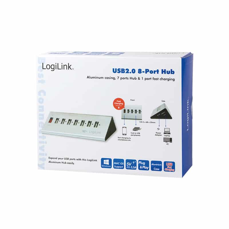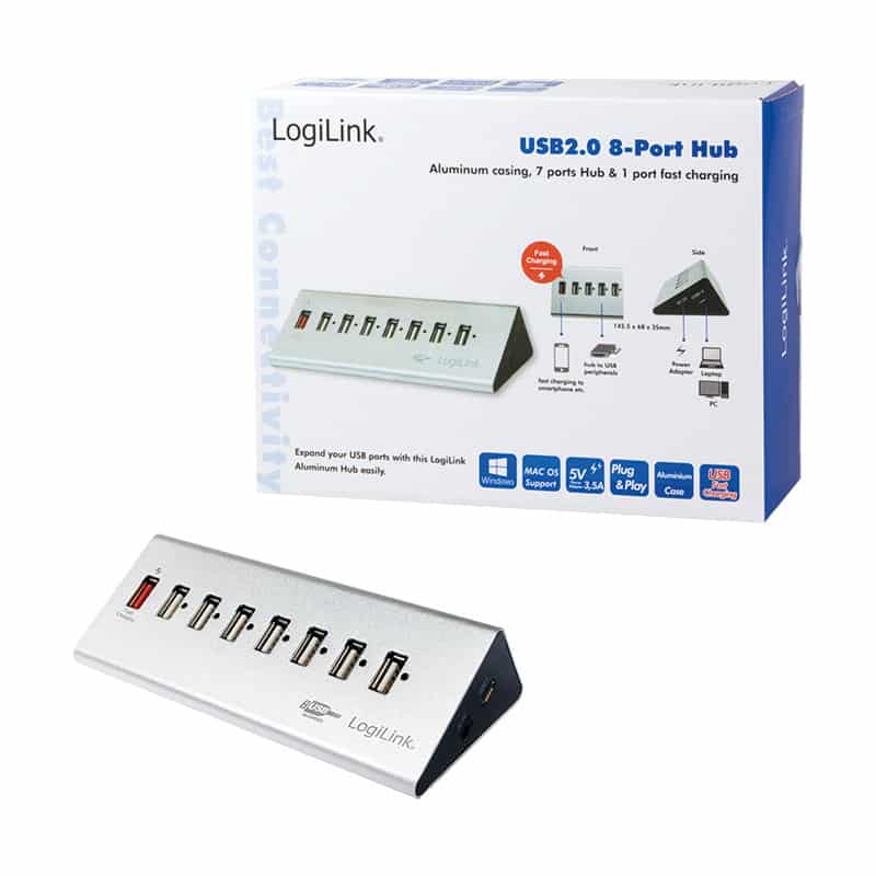 port à charge rapide, connexions: 7 x USB-A femelle, 1 x USB-A port à charge rapide (5V/2,1A), boîtier en aluminium, Smart IC Chip, vitesse de transfert: max. 480 Mbit/s., fonctionne sous Windows et Mac Os, contenu de la livraison: Hub USB 2.0, bloc d’alimentation, câble USB (UA0225)
