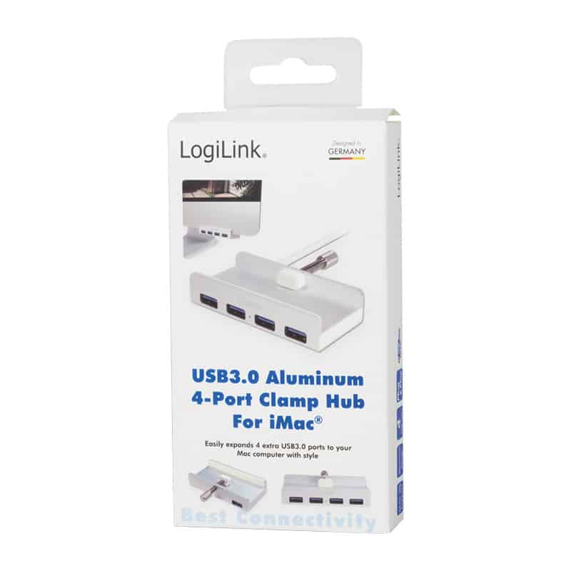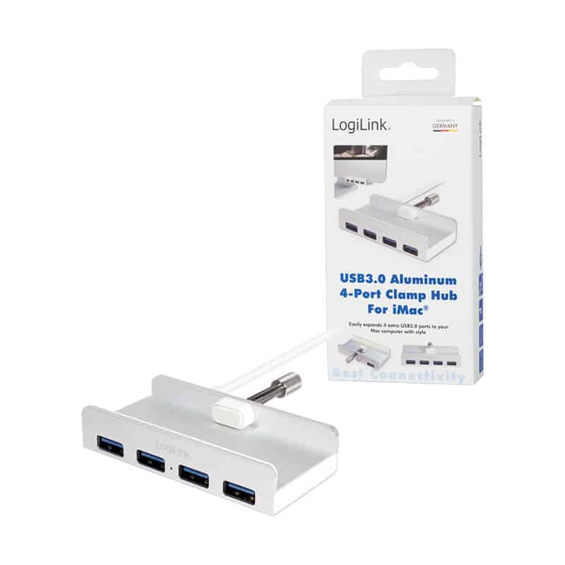 argent, 4x ports USB, compatible en aval avec USB 2.0/1.1, transfert des données: jusqu’à 5 GBit/sec., plug & play, avec pince de fixation – pour écrans jusqu’à 28 mm, longueur du câble: 350 mm, dimensions: (L)85x(P)42x(H)18 mm (UA0300)