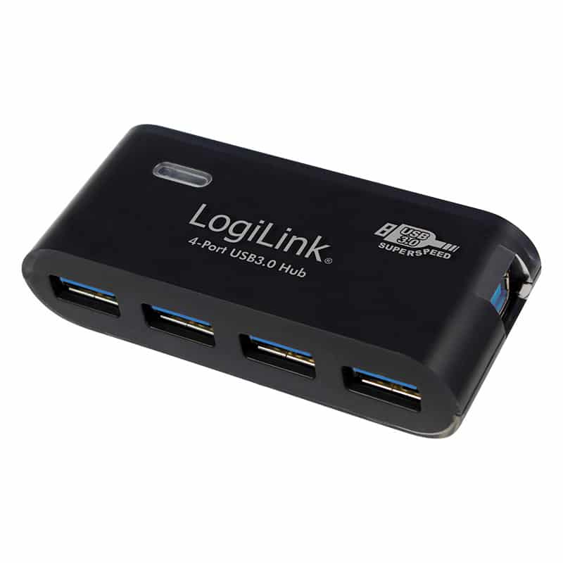 noir, connexions: 4 fiches femelle USB-A, boîtier en plastique, vitesse de transfert: max. 5GBit/s., Plug & Play, rétrocompatible aux USB 2.0/1.1, dimensions: (L)90 x (P)35 x (H)20 mm, contenu de la livraison: Hub USB 3.0, câble de connexion USB, bloc d’alimentation (UA0170)