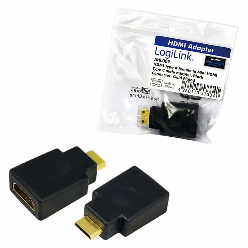 transfert de données audio et vidéo, connexion: connecteur femelle HDMI-A 19 broches – male HDMI-C 19 broches, contacts contacts, supporte 480i/480p/720p/1080i/1080p/1440p/2160p couleur: noir, dimensions: (L)20 x (P)40 x (H)11 mm (AH0009)