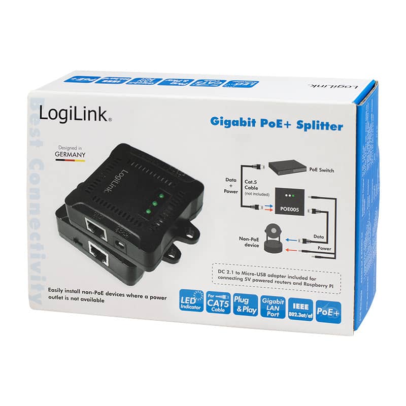 sortie: 1x RJ45 1 GBit, puissance: 24 Watt, source de courant: 5V/2.5A, 9V/2A, 12V/2A (max. 100-240 V, 50/60 Hz), chipset: AS1138, câble d’alimentation Y, couleur: noir, dimensions: (L)63 x (P)64 x (H)23 mm (POE005)
