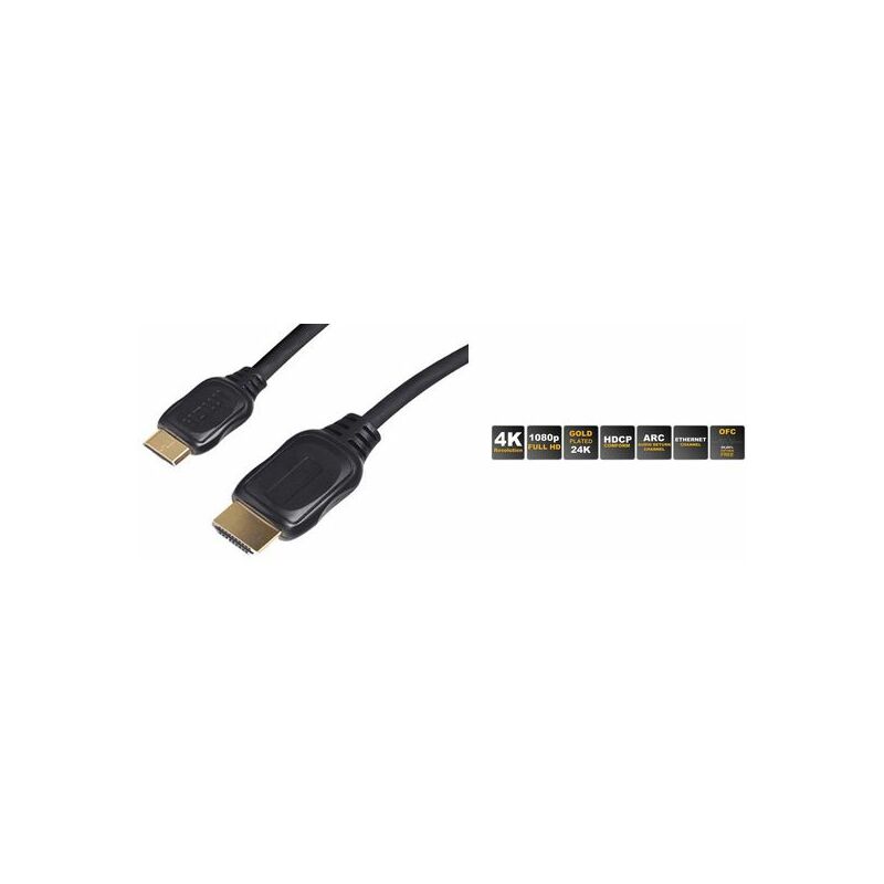 contacts plaqués or, pour qualité Full-HD (4096 x 2160 pixels), standard HDMI 1.4, compatibilité descendante avec 1.3, 1.2, 1.1, transfert jusqu’à 10,2 Gbit/s, résolution d’image 3840 x 2160 – 24, 25, 30 Hz, 4096 x 2160 – 24 Hz (BS77475-2)