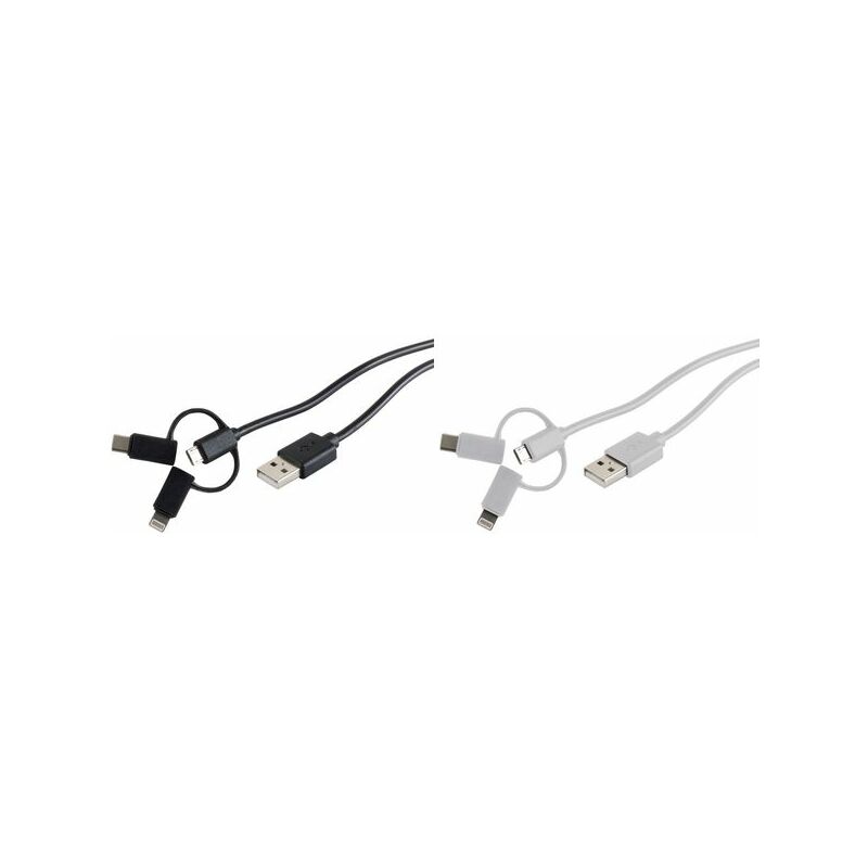 connecteurs: fiche mâle USB 2.0 A – mâle USB Micro B – mâle USB C et fiche à 8 broches, matériau gaine du câble : PVC, type de câble: rond, stucture du câble: puissance AWG24, données AWG28, vitesse de transfert max.: 480 Mbits/s, noir (BS14-15025)
